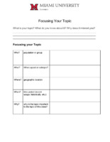 Focusing Your Topic This activity gets students brainstorming their topics before they decide what keywords to use for research. Students are asked to think about the who, what, where, when, and why of their topics. After students brainstorm, they will define three major concepts and synonyms for those major concepts to use as keywords in their database research.
